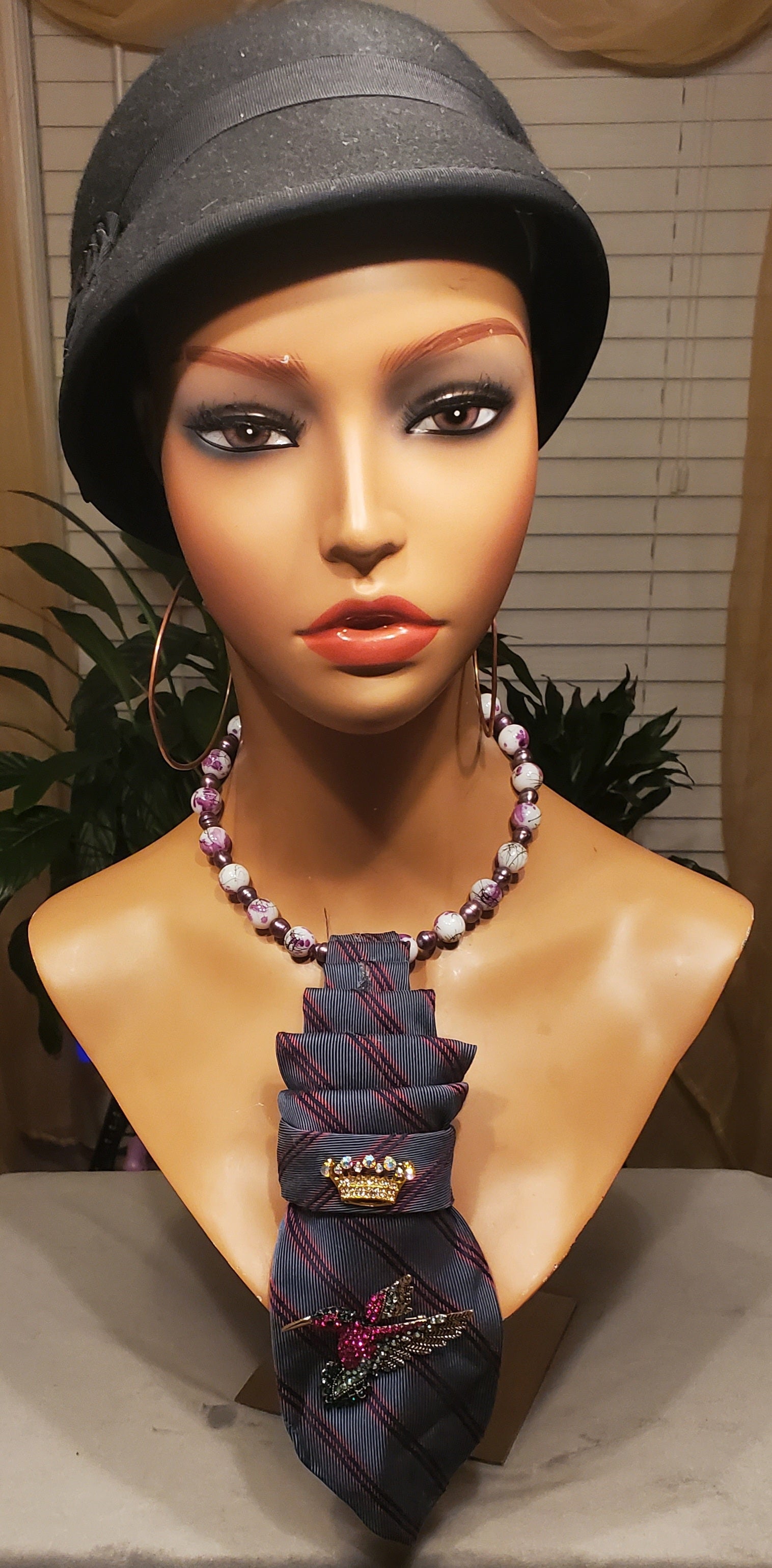 Blue Striped Necktie Necklace w/Crown and Birdie Pendant