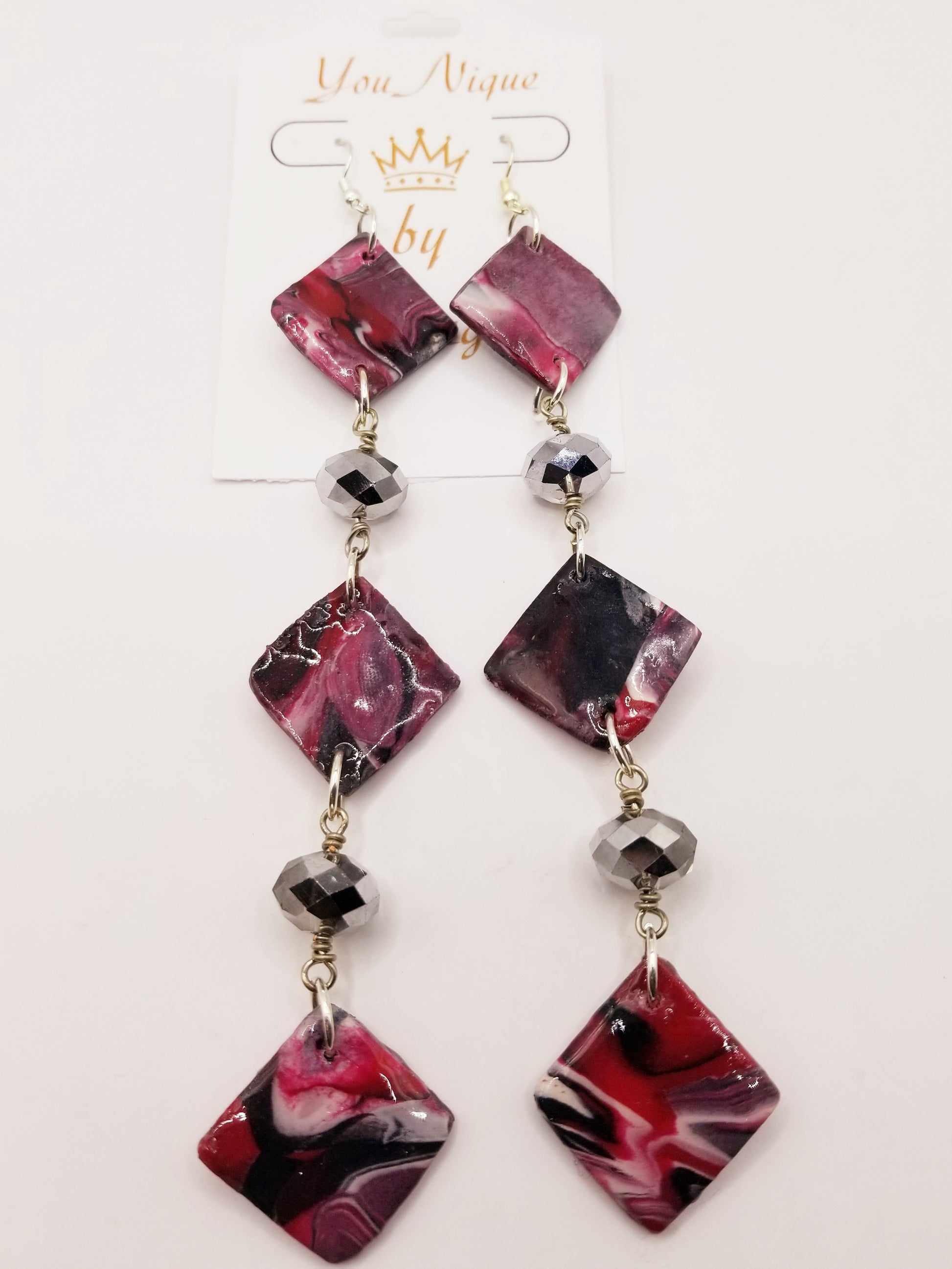 Marbled Red, White and Black 3 Diamond Dangle Earrings